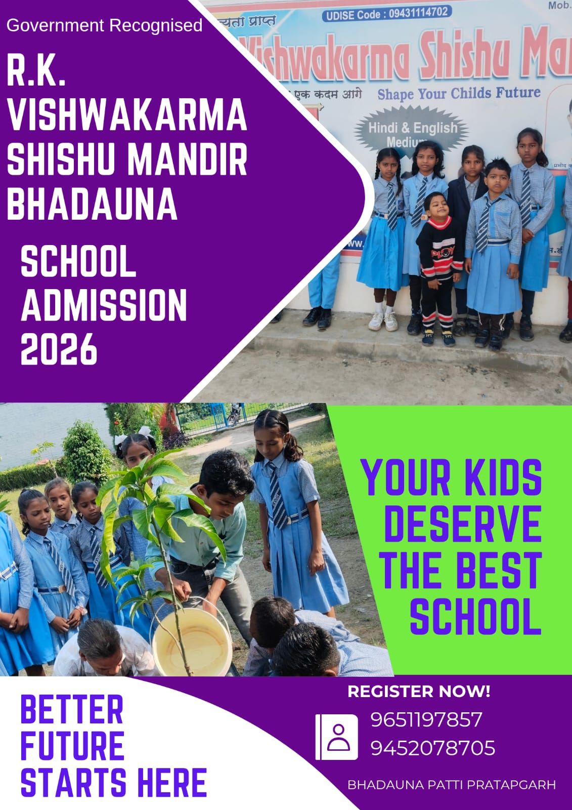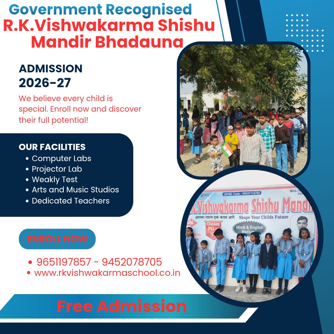 RK Vishwakarma Shishu Mandir, School Was Established In The Year 2007 With The Blessings Of Respected Father Shri Ram Karan Vishwakarma and Respeted Mother Late. Gulaba Vishwakarma. The Name Of The School Was Kept As R.K.Vishwakarma Shishu Mandir After The Name Of Our Respected Father. This School Is Situated In BhadaunaVillage Of Pratapgarh District Of Uttar Pradesh. R.K. Vishwakarma Shishu Mandir Bhadauna Is A Temple Of Education Where Efforts Are Made To Provide Good Education By Experienced, Dutiful, Skilled And Dedicated Teachers For The All-Round Development Of Children Of All Sections Of The Area.